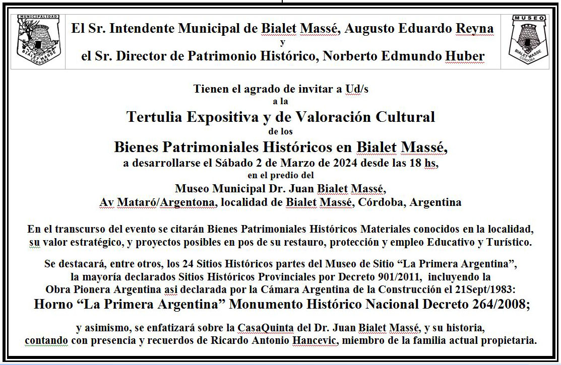 El Museo Bialet Massé reconoce como autoridad de dependencia técnica a Patrimonio Cultural de la Provincia de Córdoba.