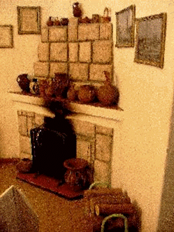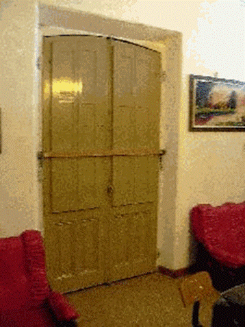 Detalle de la puerta oeste, con trancas, la ventana, y el hogar en la estancia principal, 5x9 MT.