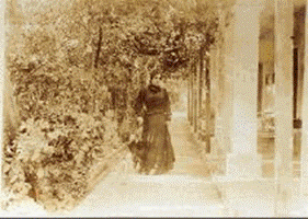 Zulema Laprida Brihuega, viuda de Bialet Massé, en la galería de la que había sido su Casa-quinta, en momentos que había vuelto a ser propiedad de sus hijos.