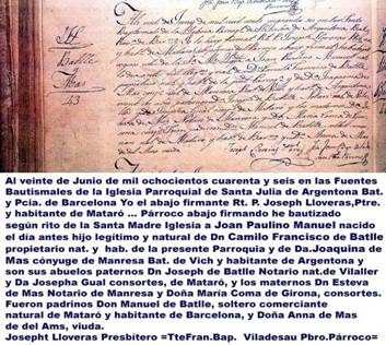 Búsquedas en WEB permitieron encontrar que Joan Paulino Manuel Batlle Mas (JBM) nació el 19 de junio de 1846 en Argentona, Cataluña, y fue bautizado en la parroquia de San Julián de Argentona, un poblado profundamente ligado a Mataró y a muy escasa distancia (5 km); y consta que sus padres fueron Camilo y Joaquina, tal como JBM aseveró en su partida de matrimonio con Zulema Laprida en 1874. JBM informó en su matrimonio con Zulema los apellidos de su madre “Massé y Comas” y en el acta de bautismo dice “Mas y Coma”.