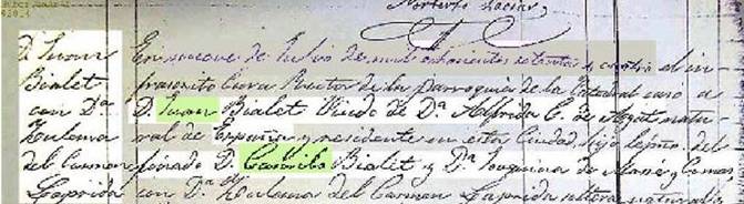 En su acta de Matrimonio con Zulema Laprida, el 9 de julio de 1874 en San Juan, consta viudo de Alfrida Calvo d’Agat, hijo de Camilo Bialet y Joaquina Mas.