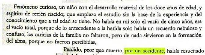 Similar comentario consta en su llamada “Autobiografía” sobre una herida que habría padecido en su infancia “… demente, casi idiota, desde los siete hasta los doce años a causa de una herida penetrante en la cabeza; me tenían por perdido …”; resulta de suma importancia cotejar dicho comentario con el motivo de la búsqueda de Camilo de su hijo Juan, por corresponder los participantes, las características del accidente y referencias temporales.