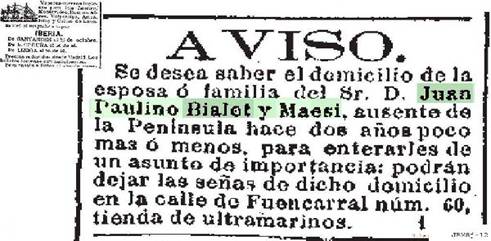 Las primeras búsquedas se orientaron a encontrar “Juan + Bialet + Massé”. En una de ellas se encuentra la siguiente publicación periodística: “…Se desea saber el domicilio de la esposa o familia del Sr. D. Juan Paulino Bialet y Maesi, ausente de la península hace 2 años poco mas o menos ...”