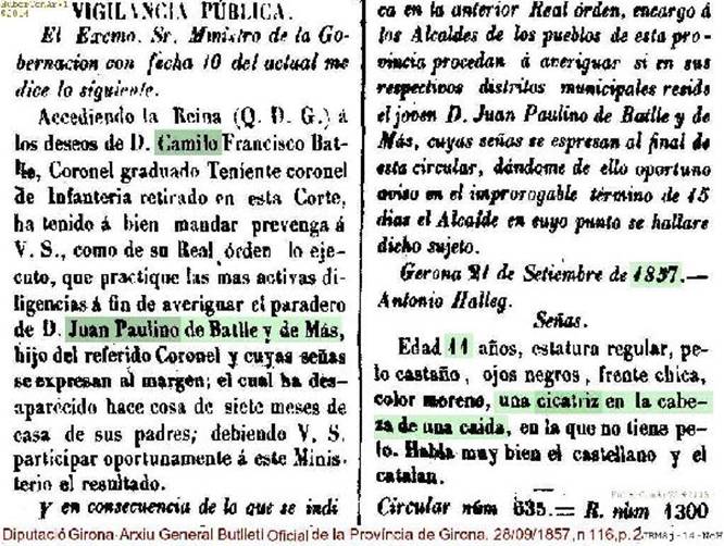 WEB “Juan+Paulino+Camilo” => “averiguar el paradero de Juan Paulino de Batlle y de Mas, hijo del..Coronel (Camilo)…cicatriz en la cabeza…catalán ”, Arxiu Diputació Girona, 28 septiembre 1857.