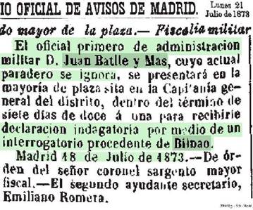 WEB “Juan + Batlle + Mas” => “Juan Batlle y Mas…oficial primero de administración militar”, desaparecido de sus lugares habituales –Bilbao- y “…cuyo paradero se ignora…”, Diario Oficial de Avisos de Madrid, 21 julio 1873.
