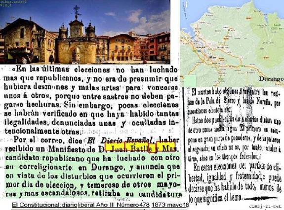 WEB “Juan+Batlle+Mas”=>“…Durango … en vista los de los disturbios… retiraba su candidatura…Juan Batlle y Mas”. *Durango a 30 km. de Bilbao”, El Constitucional, Diario Liberal, 18 Mayo 1873.